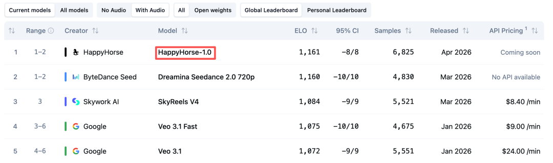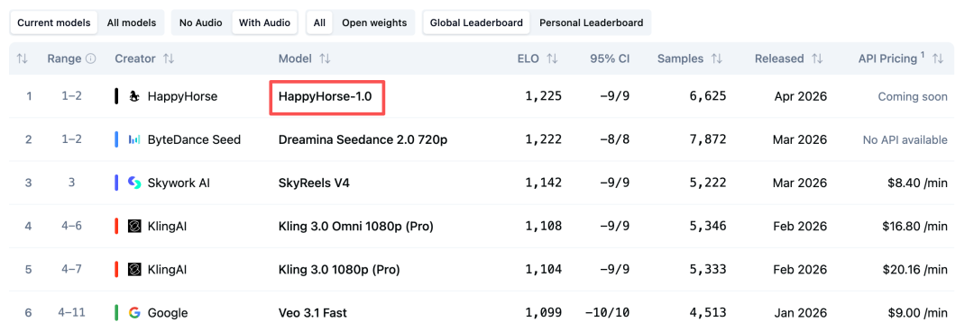 而在有音频赛道,目前HappyHorse-1.0也已经拿下全球第一的成绩,超越Seedance 2.0。