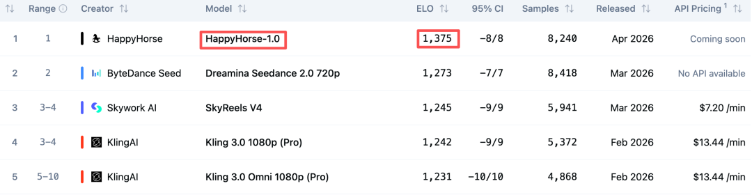 一个神秘模型——HappyHorse-1.0悄然登顶Artificial Analysis的AI Video Arena排行榜,力压Seedance和可灵。