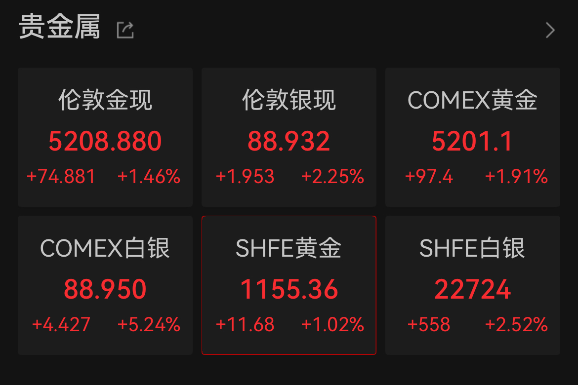 当晚,黄金、白银大涨,现货黄金突破5200美元、现货白银向上触及89美元。截至发稿,伦敦金现、伦敦银现涨幅分别为1.46%、2.25%,COMEX白银涨幅扩大至5.24%。