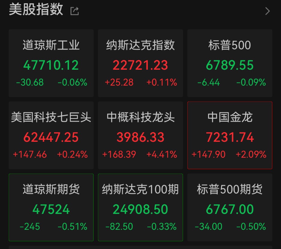 美股涨跌不一。截至发稿,道指下跌0.06%,标普500指数下跌0.09%,纳指上涨0.11%。